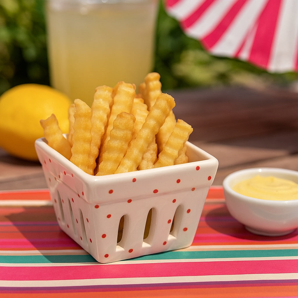 Transforma servirea gustarilor intr-o experienta estetica cu acest bol ceramic unic, cu perforatii laterale verticale care imita cu gratie aspectul unui cosulet de servire. Fiecare detaliu al acestui bol aduce o nota de rusticitate intr-un mod rafinat, redefinind prezentarea aperitivelor tale.