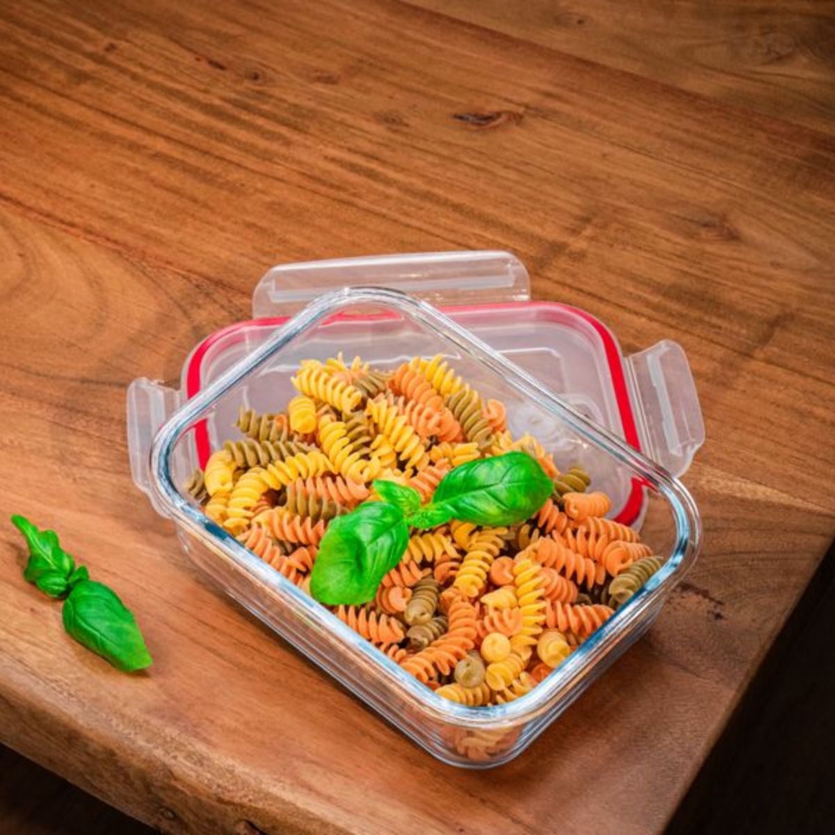 Recipient dreptunghiular MagicHome BSG2, 1000 ml, sticlă borosilicată cu capac din polipropilenă și închidere cu clemă. Păstrează mâncarea proaspătă și sigură.