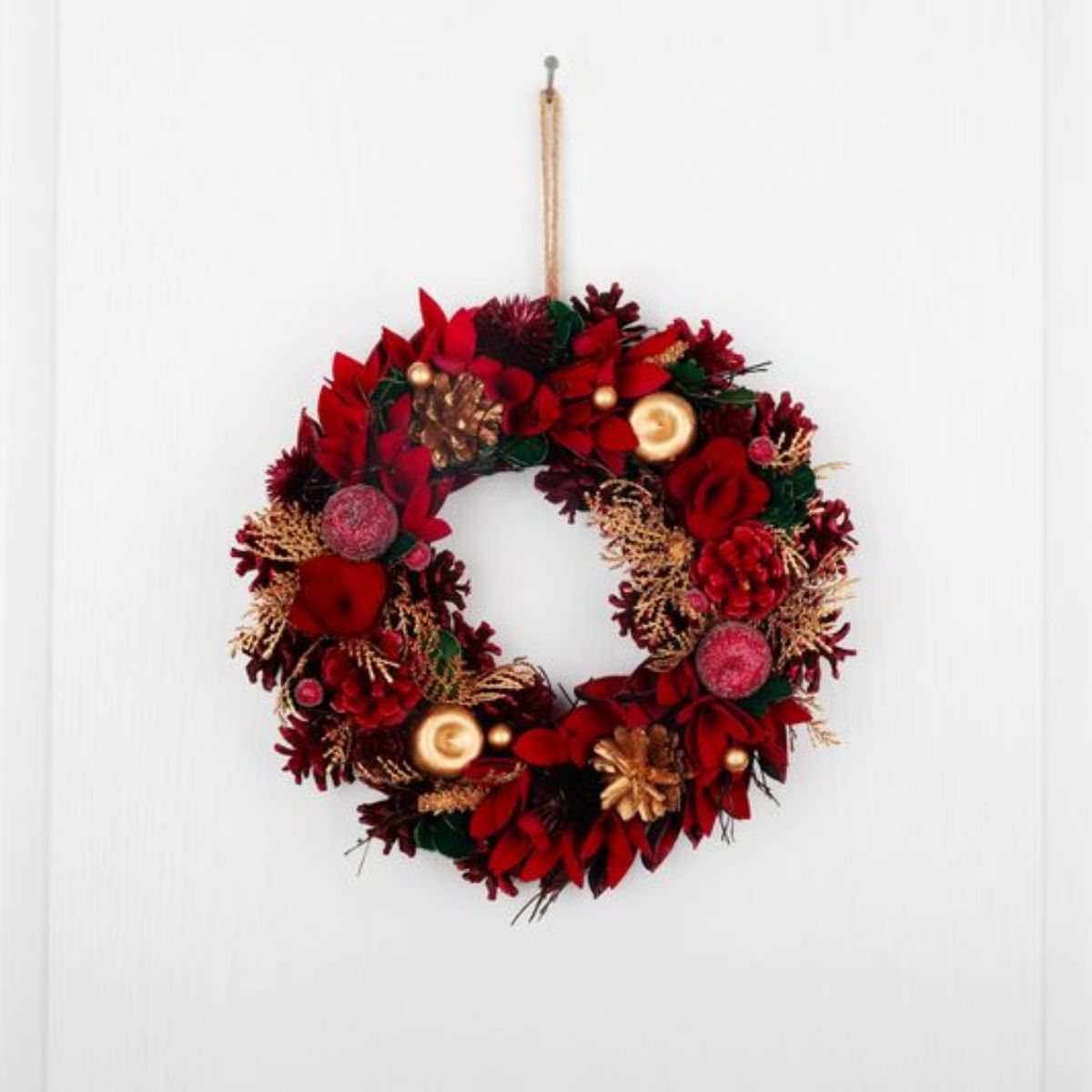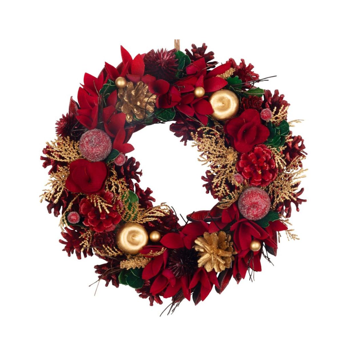 Coronița de Crăciun MagicHome, într-o combinație de roșu și auriu, este o decorațiune frumoasă și elegantă, care va aduce o adevărată atmosferă festivă în casa ta. Este decorată cu elemente detaliate - conuri, globuri, flori și ornamente strălucitoare într-un design luxos roșu-auriu.
