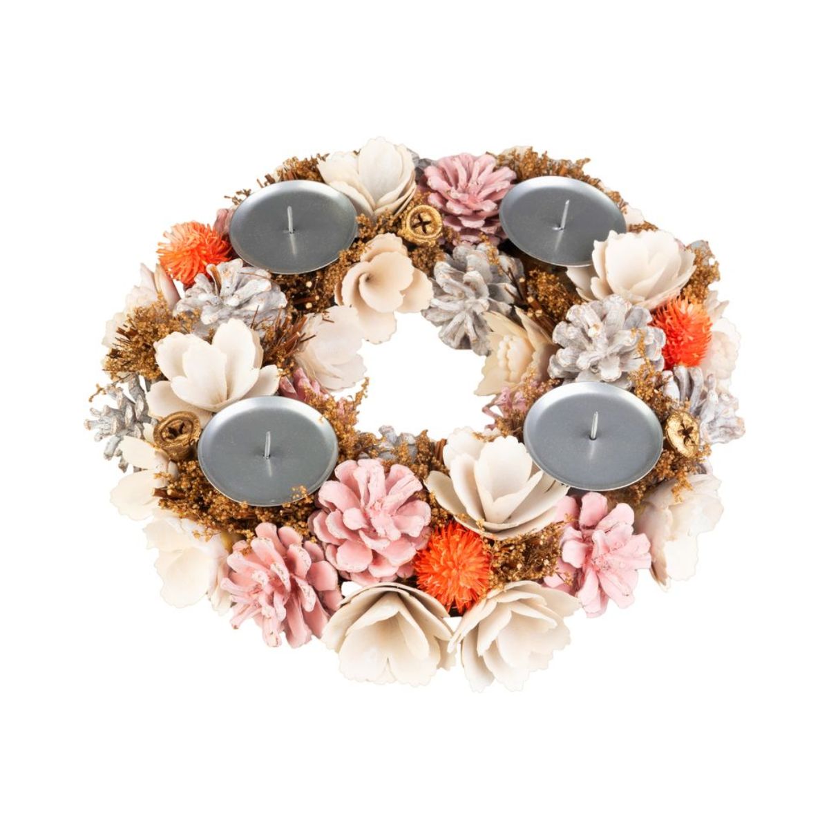 Coroniță de Crăciun MagicHome, într-o combinație de roz și portocaliu pal, este completarea perfectă pentru decorațiunile tale de sărbători. Este decorată cu conuri de pin, flori și mici ornamente în combinație cu materiale naturale, care creează un aspect elegant și proaspăt.