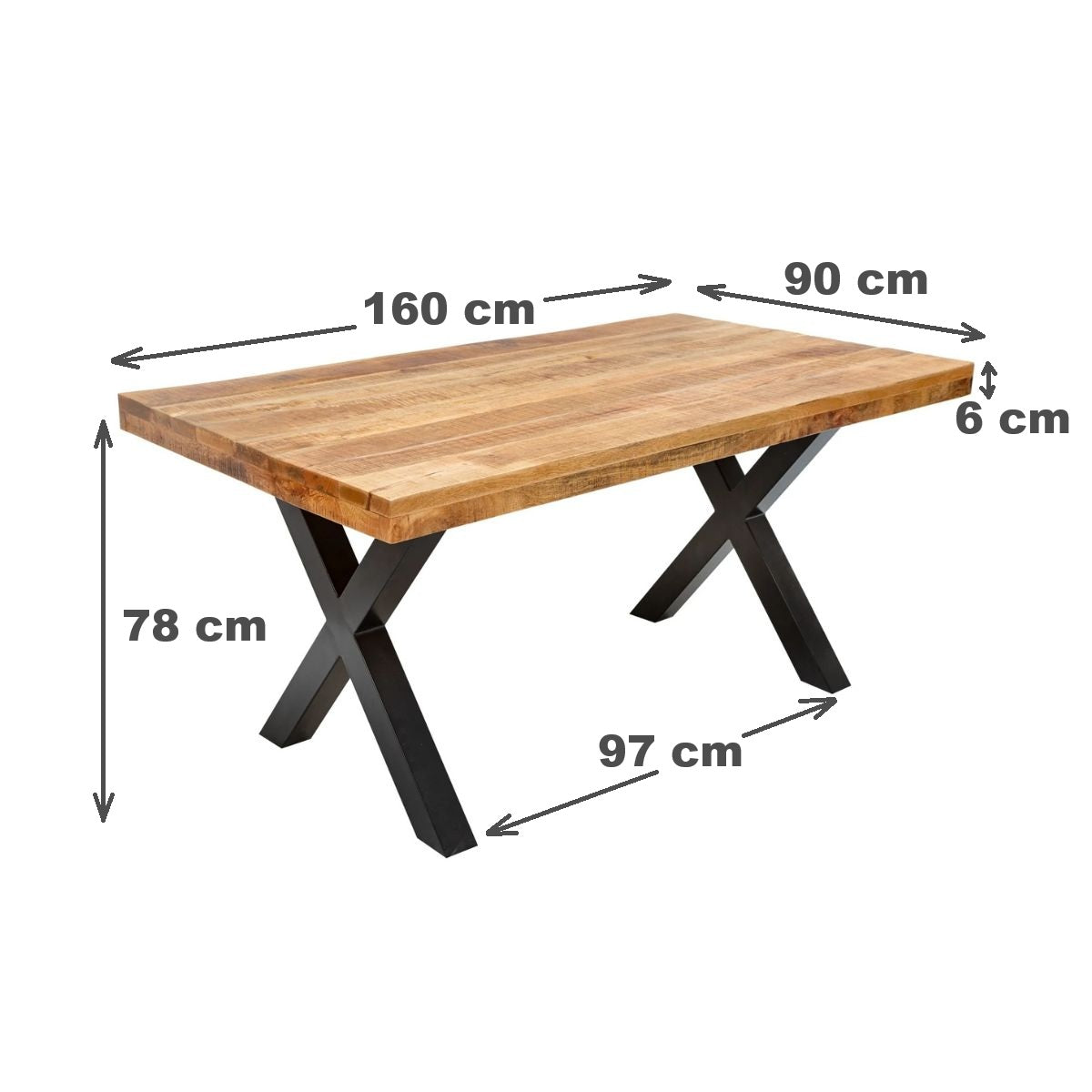 Masa „Veda X” aduce împreună naturalețea lemnului masiv de mango și eleganța designului modern. Blatul are o grosime de 30 mm, iar pe partea inferioară este întărit cu o ramă suplimentară din același lemn, care dublează grosimea vizibilă la 60 mm pe margine, oferind un plus de rezistență și un aspect solid.