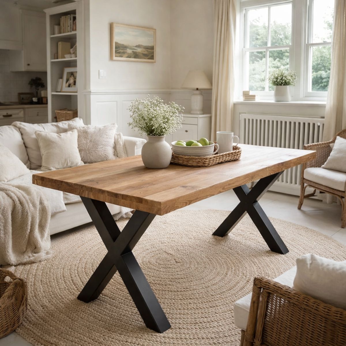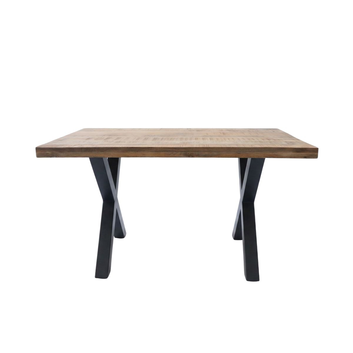 Picioarele din metal negru, cu design în formă de X și secțiune de 7,5x7,5 cm, oferă stabilitate maximă și libertate de mișcare pentru picioare. Liniile lor moderne completează perfect căldura lemnului, rezultând o masă cu un aspect contemporan și industrial în același timp.