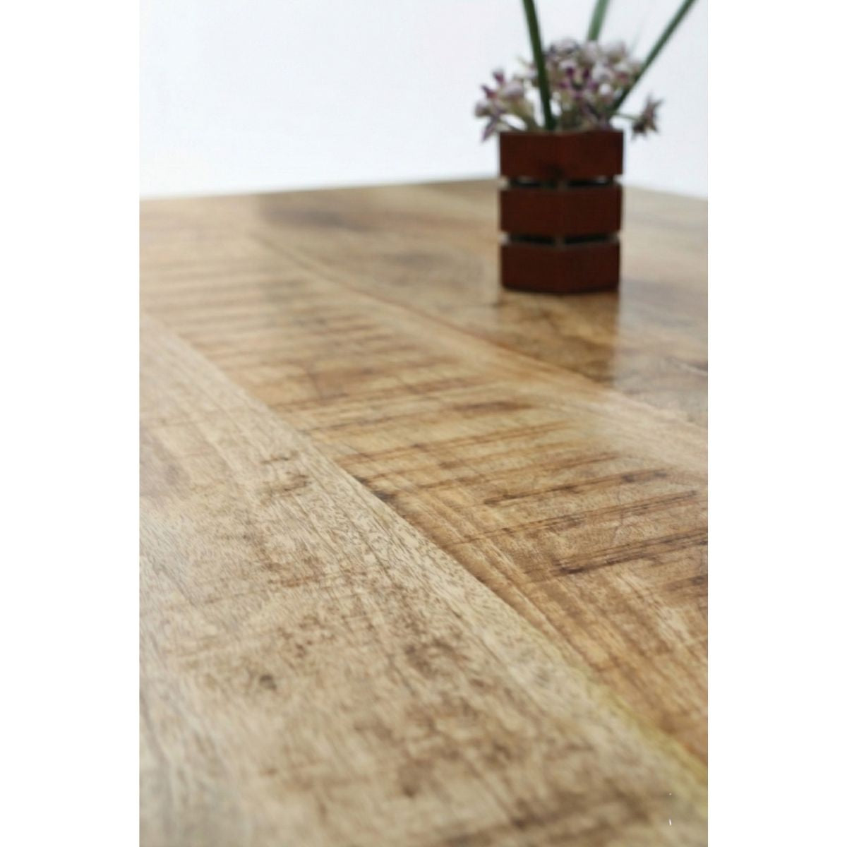 Suprafața blatului păstrează frumusețea autentică a lemnului, cu mici striații și denivelări, ce dau fiecărei mese un caracter unic și natural.
