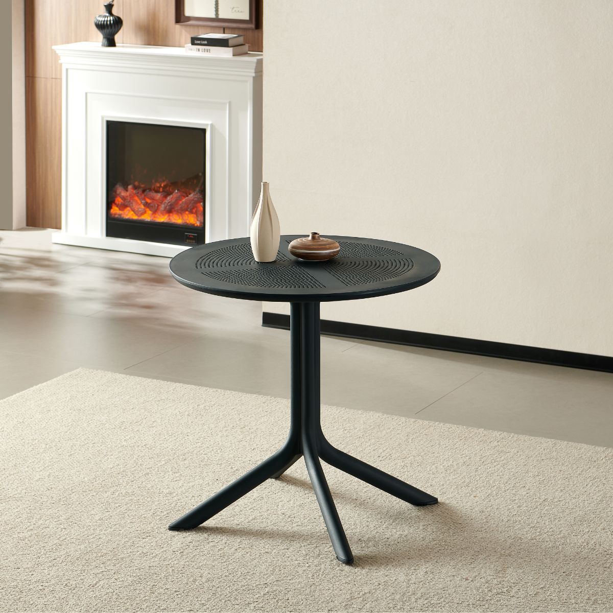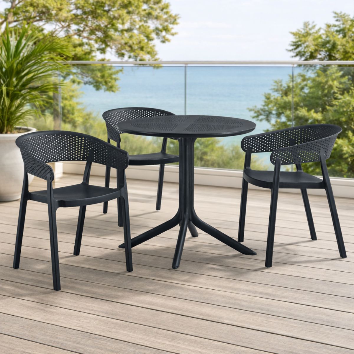 Fabricată din polipropilenă durabilă, rezistentă la intemperii, raze UV și umiditate. Blat pătrat cu perforații – previne acumularea apei și adaugă un plus de stil. Picior central robust, cu bază în patru puncte de sprijin pentru stabilitate sporită. Dimensiuni: Ø80 cm, înălțime 74 cm – perfectă pentru 2–4 persoane.
