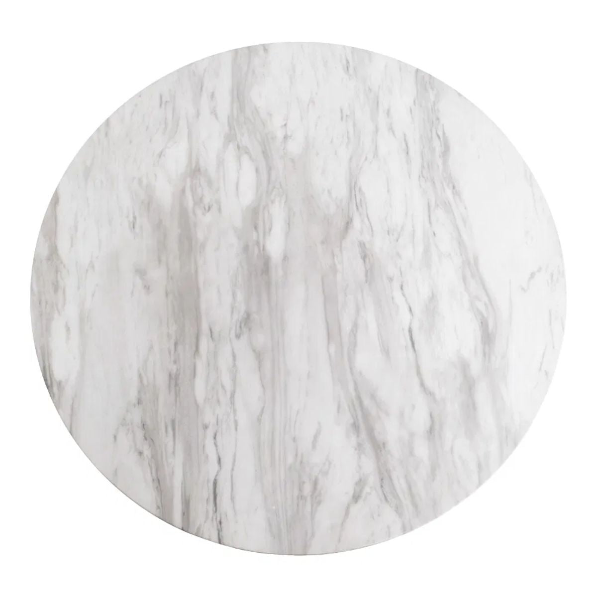 Blatul rotund, realizat din MDF, reproduce fidel textura și vinișoarele gri de marmură naturală, oferind un efect vizual luxuriant fără întreținerea dificilă a pietrei. Suportul și baza din oțel finisat auriu conferă stabilitate și un accent glamour, transformând măsuța într-un punct de atracție în orice încăpere.