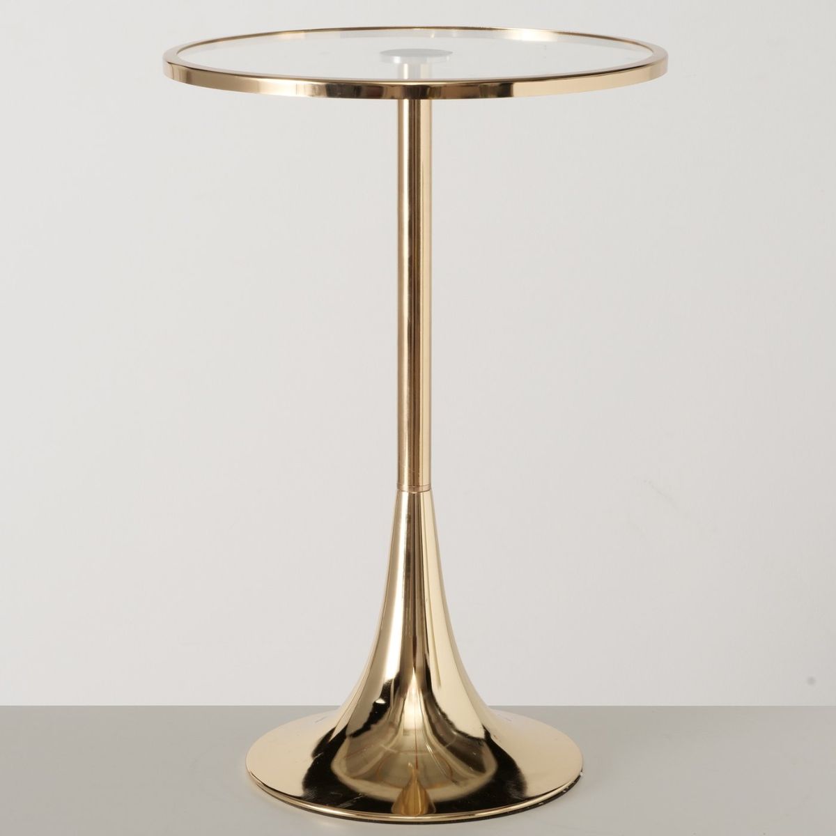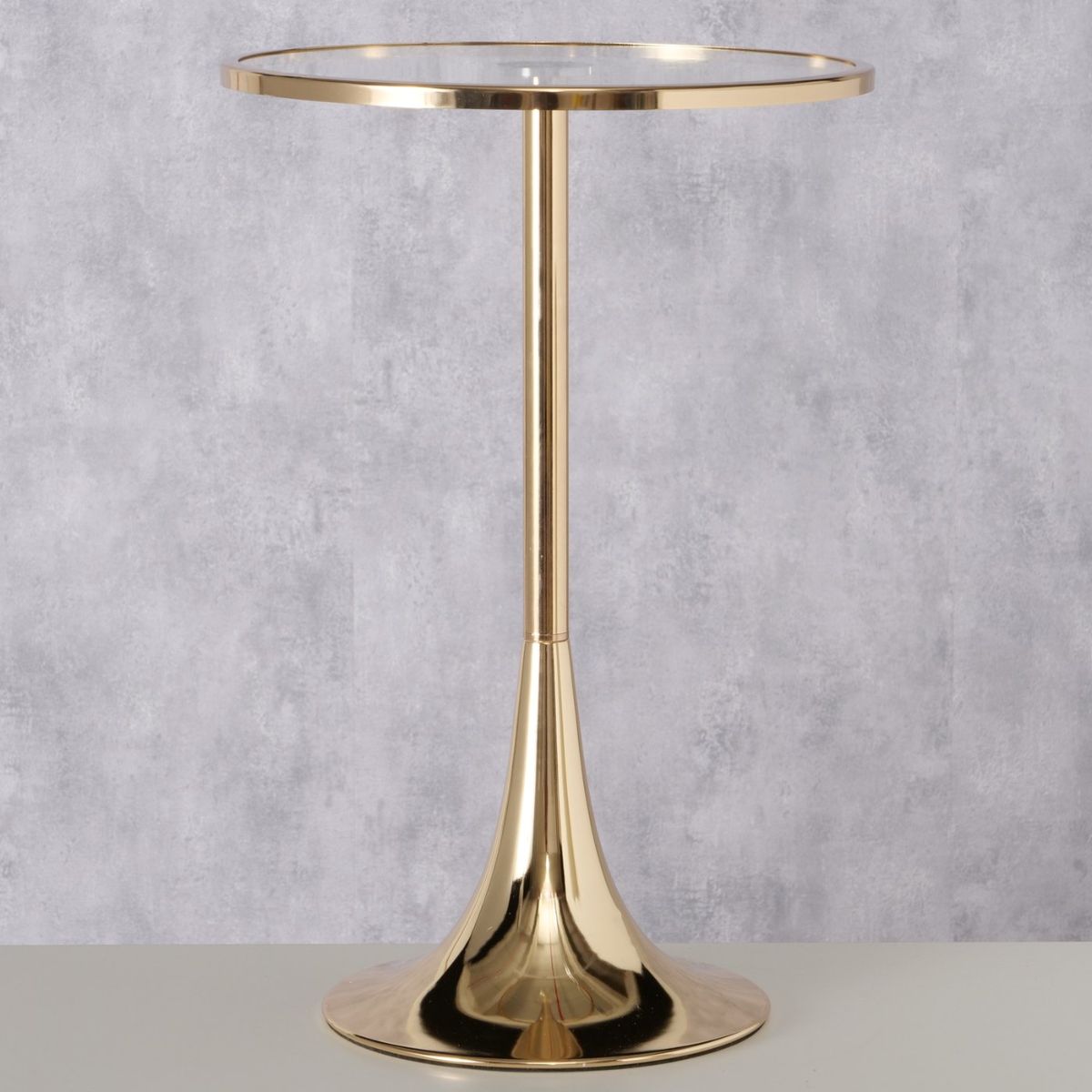 Blat rotund din sticlă securizată – transparent cu ramă metalică aurie, rezistent și ușor de întreținut. Picior central tip trompette, din metal vopsit auriu – stabil, durabil și cu un aspect contemporan. Bază rotundă solidă pentru echilibru și siguranță.