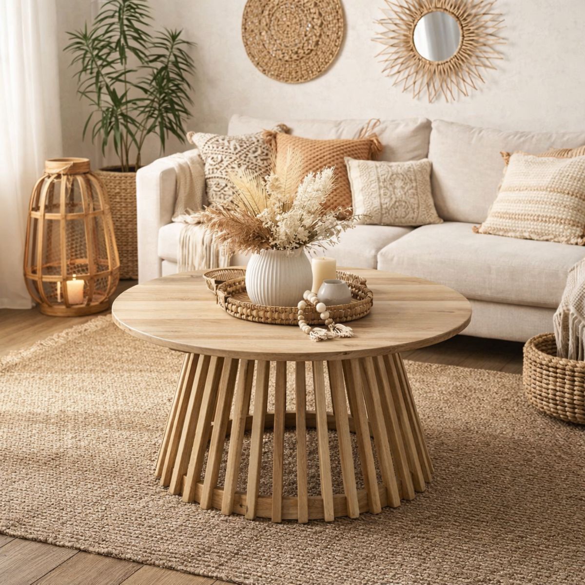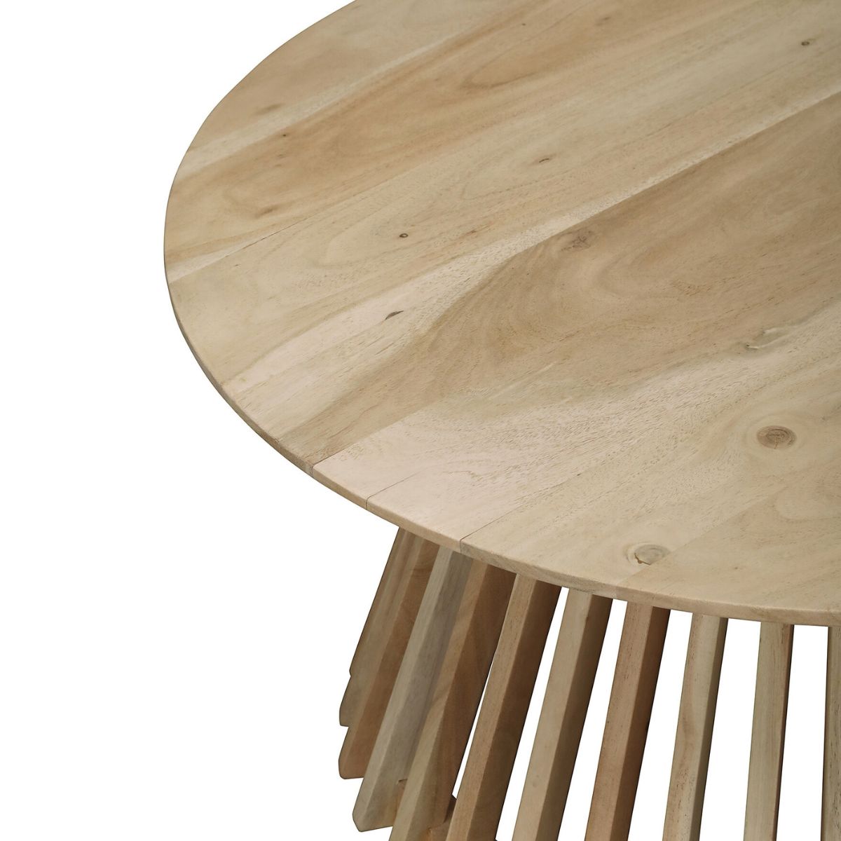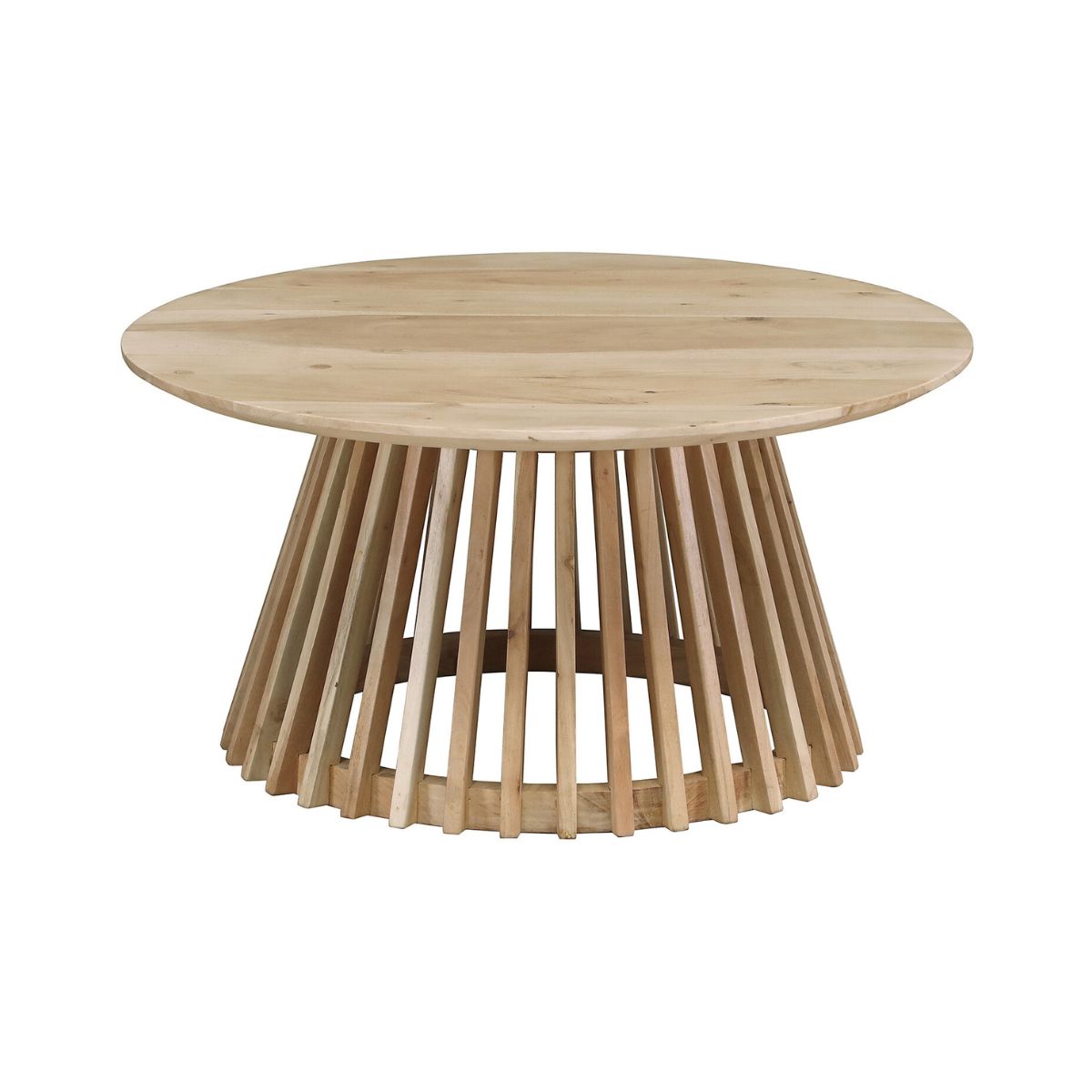 Blatul rotund, cu diametrul de 80 cm și grosimea de 30 mm, cu margine elvețiană, este solid și rezistent, oferind spațiu ideal pentru cafea, cărți sau pentru decorațiunile preferate. Piciorul central conic este realizat din elemente de lemn, în mănunchi evazat cu bază largă, ceea ce conferă stabilitate, dar și un aspect deosebit, aerat și rafinat.