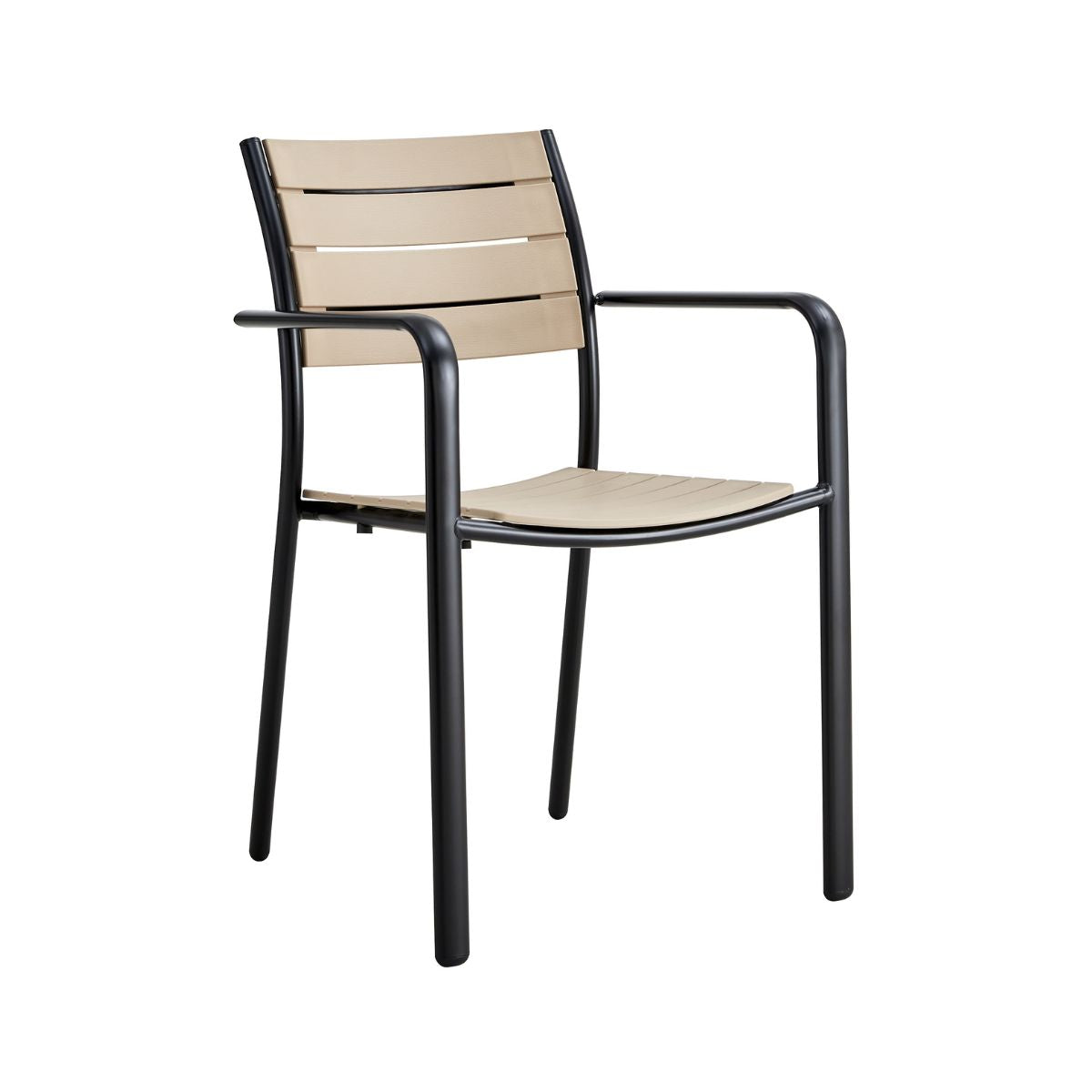 Structură din metal vopsit in camp electrostatic, cu tratament împotriva ruginii și durabilitate extinsă. Șezut și spătar din polipropilenă – confortabil, ușor de întreținut și rezistent la factorii de mediu. Design ergonomic cu cotiere integrate – pentru un plus de confort.