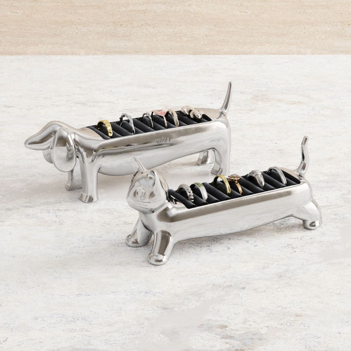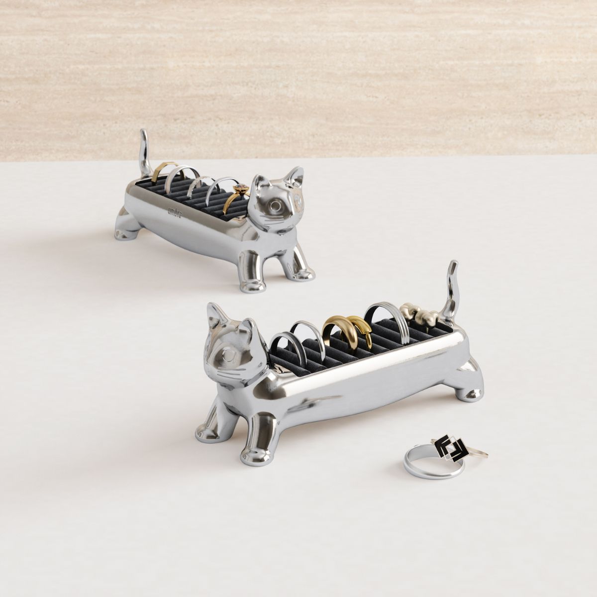 Faceți cunoștință cu Ali Cat, un suport pentru inele inspirat de farmecul jucăuș al pisicilor munchkin, o rasă cu picioare scurte. Conceput cu pernițe căptușite cu catifea pentru a vă păstra inelele în siguranță și fără zgârieturi, Ali Cat poate susține până la 9 inele, fiind la fel de practic pe cât este de adorabil. Fie că este așezat pe o noptieră, o comodă sau un birou, acest accesoriu fantezist adaugă o notă de distracție felină oricărui spațiu. Ali Cat este cadoul suprem pentru orice iubitor de pisici din viața dumneavoastră. Fabricat din metal, cu un finisaj cromat lucios, acest accesoriu adorabil este atât robust, cât și elegant. Fiecare piesă este lustruită manual cu grijă, fiecare articol având propriul caracter și strălucire unică. Pot apărea mici variații în finisaj datorită naturii lucrate manual a produsului.